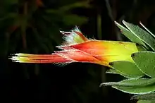 The bract subtending the individual flower is line- to awl-shaped, 5–8 mm (0.20–0.32 in) long and about 1 mm (0.04 in) wide, hairless except for a row of minute hairs along the edges. The 4-merous perianth is 3–4 cm (1.2–1.4 in) long and straight. The lower part, that remains merged when the flower is open, is squared in cross-section, hairless and about ½ cm (0.2 in) long. The segments in the middle part (or claws), are thread-shaped, slightly powdery hairy near the base and silky hairy towards the top. The segments in the upper part (or limbs), which enclosed the pollen presenter in the bud, are line-shaped with a pointy tip in outline, boat-shaped, and covered in silky hairs. The four anthers lack a filament and each is directly merged with one of the limbs. From the centre of the perianth emerges a red-coloured style of 5–5½ cm (2.0–2.2 in) long that is slightly bent. The thickened part at the tip of the style called pollen presenter is about 4 mm (0.16 in) long, has a ring-shaped thickening at its base and the groove that functions as the stigma sits across the very tip. The ovary is egg-shaped, minutely powdery and about 2 mm long (0.04 in). It is subtended by four fleshy, blunt, rounded rectangular scales of about 2 mm (0.08 in) long. The ovary will develop into a cylindric fruit of 6–7 mm (0.24–0.28 in) long and 1½–2 mm (0.06–0.08 in) wide.[2]