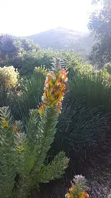 Mimetes hirtus is an upright, evergreen shrub of 1½–2 m (5–6½ ft) high from the family Proteaceae. It has upright, overlapping, (broadly) lance-shaped leaves, without teeth, but with one thickened pointy tip. It has cylindric inflorescences topped by a pine apple-like tuft of pinkish-brownish, smaller and more or less horizontal leaves. The flowerheads are tightly enclosed by yellow, red-tipped bracts, only the 9–14 long red styles and the whitish silky tips of the perianth sticking out. It is primarily pollinated by the Cape sugarbird. It is an endemic species of the southwest of the Western Cape province of South Africa, and grows in wet zones at the base of south facing mountain slopes. Flower heads may be found from May to November, but peaks in July and August. The species has several vernacular names of which marsh pagoda seems to be used most.[2][3]
