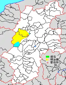 * yellow - areas formerly within the district borders during the early Meiji period