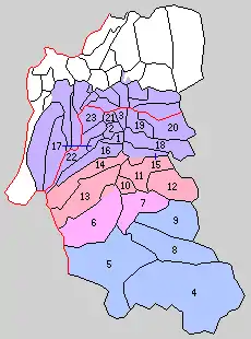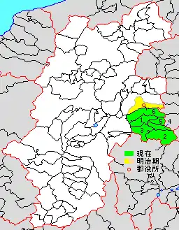 * yellow - areas formerly within the district borders during the early Meiji period