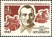 Shmyryov's portrait was featured on a postage stamp in the 1967 series of stamps honoring the greatest heroes of the partisan resistance movement.