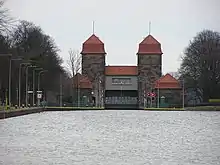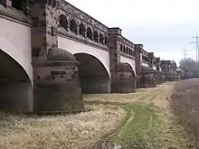 The Minden Aqueduct (German: Wasserstraßenkreuz Minden) is an aqueduct near Minden, North Rhine-Westphalia, Germany. It actually consists of two parallel water bridges, that lead the Mittelland Canal over the Weser. The older of the two bridges is no longer used for shipping. After the Magdeburg Water Bridge, it is the second biggest aqueduct in Europe.