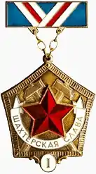 Miner's Glory (Russian: Znak shakhtyorskaya slava, Знак «Шахтёрская слава») is an honorary badge introduced in the Soviet Union in 1956 and continued in Russia. It is an award for the labour achievements of the workers in the mining industry and in some cases, for supporting work (new technologies, fight with disasters, work in adjacent industries, etc.)