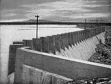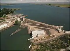 The Minidoka Dam is an earthfill dam in the western United States, on the Snake River in south central Idaho. Completed in 1906, the dam is east of Rupert on county highway 400; it is 86 feet (26 m) high and nearly a mile (1.6 km) in length, with a 2,400-foot (730 m) wide overflow spillway section.[2]