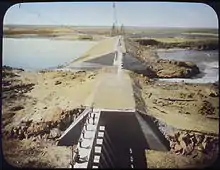 The Minidoka dam was the first Reclamation Service project in Idaho, part of the Minidoka Project of dams, reservoirs and canals. Construction began in 1904 and by 1906 most of the dam's canals and laterals were finished. By 1909, Minidoka Dam's power plant, the first federal power plant in the northwest, was completed.[3] By its completion, the total cost of the dam was $5.8 million, which exceeded estimates. The Minidoka project brought water into the southeastern areas of Idaho near the cities of Rupert and Burley. The project was successful, as what was once an uninhabited sagebrush desert is now bountiful farmland. The powerplant installation was significant as a precursor of much larger projects on the Columbia River, including Bonneville Dam.[2]