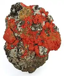 Minium is rare and occurs in lead-mineral deposits that have been subjected to severe oxidizing conditions. It also occurs as a result of mine fires. It is associated with cerussite, galena, litharge, massicot, mimetite, native lead, and wulfenite.[2]