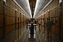 The main building is 540 feet (165 m) long. Its interior is unchanged and postal customers still utilize its original bronze teller cages and fixtures, marble terrazzo floor and sandstone walls. Perhaps the longest light fixture in the world, a 350-foot (107 m), 16-ton (16256.8 kg) bronze chandelier runs the length of the lobby, originally designed to regulate temperature.[1]