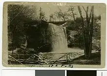 J.B. Hodge, the railroad depot agent who had championed tourism at the falls, became the park's first superintendent. With state funding he was able to improve safety and access to the gorge, replacing the wooden stairs with cement steps and installing a railing, netting, and picnic tables.[17] Over the next decades, other developments included a bridge into the park, a refreshment stand, a large picnic shelter, and stabilization of the waterfalls.[6] Locals continued to take a strong, almost proprietary interest in the park. In 1927, the head of the park's local advisory board planted an orchard of black walnut trees (thinking nut sales could be a future source of funding), and only informed the state after the fact in a letter.[17]