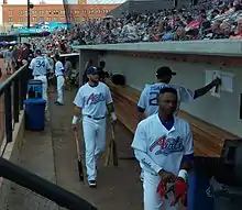 St. Paul Saints players wearing Mr. Paul Aints jerseys in dugout at CHS Field
