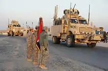 Soldiers from the 1st Brigade Combat Team, 34th Red Bull Infantry Division stand at attention with the brigade colors as 1/34th BCT Caiman vehicles cross the Iraqi border into Kuwait for the last time