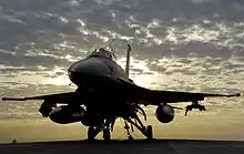 An F-16C Fighting Falcon sits tethered to the hot cargo pad at Joint Base Balad, Iraq in the early morning of New Year's Eve 2008. The aircraft is tethered to secure it in place prior to a full afterburner engine run-up.