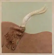A different type of fresco is the relief fresco, also called "painted stuccos",[51] where the plaster has been formed into a relief of the main subject before it is painted, probably in imitation of Egyptian stone reliefs. The technique is mostly, but not exclusively, used at Knossos, between MM II and LM I. The figures are large, and include humans, bulls, griffins and a lion seizing prey; the few fragments worked up into the so-called Prince of the Lilies (AMH) are of this type.[52]