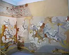 There may also have been ceiling reliefs of patterns of ornament; the Minoans also painted some floors with "normal" frescos, and the well-known scene of dolphins from Knossos may have been a floor-painting.[53]