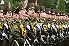 The order now concluded, the parade then marches off in quick time with the drummers of the Corps of Drums of the Minsk Suvorov Military School setting the pace. As the Corps' bandmaster orders the halt, the massed bands start playing a military march (usually Letter from the 45th by Igor Luchenko as the first song) as he salutes while the drummers swing on the eyes right position. The drummers are just the first of the large ground column of an estimated 2,900 service personnel that marches past the presidential grandstand. There are generally 10 officers and around 140 conscripts in each formation.[1] At the end of the ground columns, the massed bands play Den Pobedy by David Tukhmanov before sounding off to The Sacred War as the mobile column passes through.[2] The exhibition drill at the end of the parade, performed by the Honor Guard of the Armed Forces of Belarus has been held annually since 2002 and shows off the military drill of the armed forces. Following the drill routine, the massed bands sing Our Fatherland's Flag (Айчыны нашай сцяг) before marching off the avenue, officially closing the parade.[3]
