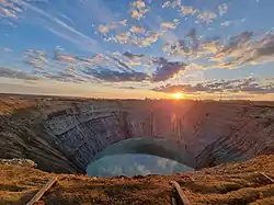 The Mir mine (Russian: кимберлитовая алмазная трубка «Мир» kimberlitovaya almaznaya trubka "Mir"; English: kimberlite diamond pipe "Peace"), also called the Mirny mine, is an open pit diamond mine located in Mirny, Sakha Republic, in the Siberian region of eastern Russia. The mine is more than 525 meters (1,722 ft) deep (4th in the world), has a diameter of 1,200 m (3,900 ft),[1] and is one of the largest excavated holes in the world.
