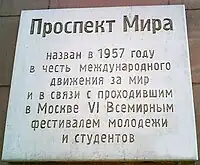 - ↑ See the plaque above. "назван в 1957 года в честь международное движения за мир и в связи с проходившим в москве..." (Named in 1957 in honor of the International Peace Movement due to take place in Moscow")