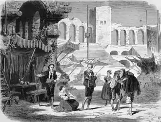 During the course of composition Gounod spent much time in Provence (12 March to the end of May 1863), visiting the sites of the action in the poem/opera, and met Mistral on several occasions at his home in Maillane.[6] Gounod stayed at the Hôtel de la Ville Vert in Saint-Rémy-de-Provence, and was treated to a banquet by the townspeople on 26 May.[3] Presenting class differences in a rural setting was not usual at the time, and as the musicologist Steven Huebner comments "some early reviewers had difficulty accepting that a 'mere' country girl could sing an aria with heroic cut such as 'En marche'."[7]