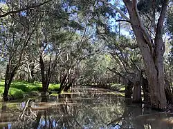 Mirrool Creek (technically a river[1]) rises in the Ingalba Nature Reserve, about 15 kilometres (9.3 mi) west by south of the town of Temora, sourced by runoff from the Great Dividing Range. The creek flows generally north northwest, west, north by west, and west again for approximately 115 kilometres (71 mi), joined by four minor tributaries, before becoming indefinite approximately 3 kilometres (1.9 mi) south southwest of Barellan. The Mirrool Creek rises again approximately 20 kilometres (12 mi) east of Griffith and flows for approximately 75 kilometres (47 mi) west southwest, and to the south of Yenda, Bilbul, Hanwood and Griffith, before heading northwest by north and flowing into the Barren Box Swamp, where the creek does not drain above the land surface. The Mirrool Creek rises again southwest of the village of Goolgowi and flows west and then west southwest, joined by one minor tributary, before reaching its confluence with the Lachlan River, north northwest of the town of Hay. The creek descends 191 metres (627 ft) over the entire 264-kilometre (164 mi) course.[2][3][4]