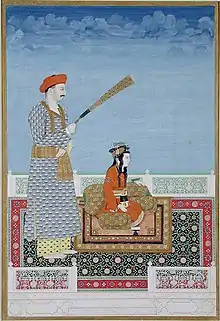 ![]() Mirza Salim (seated) while Tabiriyat Khan waving the fan | |||||