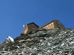 The Mischabel Hut (German: Mischabelhütte) is a mountain hut of the Academic Alpine Club of Zurich, located west of Saas Fee in the canton of Valais. It lies at a height of 3,340 metres (10,960 ft) above sea level near the Hohbalmgletscher glacier, on the eastern flanks of the Dom and the Lenzspitze in the Mischabel group.