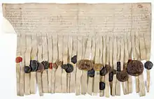 - ↑ A "mise" in this context is a settlement by agreement. The use of the word in this sense is very rare in English, and is normally reserved for the Mise of Amiens and the Mise of Lewes from later the same year. It is the feminine past participle of the French verb mettre (to put), and is pronounced /ˈmiːz/.[1]