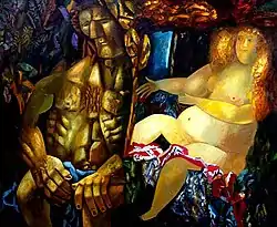 "The Rape of Europa", "Leda and the Swan, "Little red riding-hood", "Tomcats", "Woman on Horse", "Hunting Lions", and the biblical themes, especially "Peter and the Rooster", and even the renowned tragic composition "Pieta. To the victims of war" are understood in a new interpretation (but in no way a repetition) in the harmony of contrasts, and not as a confrontation between them using various styles.