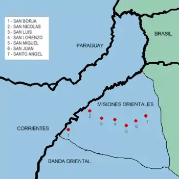 The Misiones Orientales (Spanish pronunciation: [miˈsjones oɾjenˈtales], lit. 'Eastern Missions') or Sete Povos das Missões/Siete Pueblos de las Misiones (Portuguese pronunciation: [ˈsɛtʃi ˈpɔvuz dɐz miˈsõjs], lit. 'Seven Towns of the Missions') is a historic region in South America, in present-day Rio Grande do Sul, the southernmost State of Brazil.