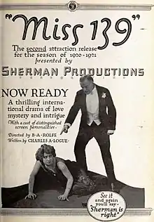 Miss 139 is a 1921 American silent crime drama film produced by A. H. Fischer and distributed by Jans Film Service and Sherman Productions Corporation. B. A. Rolfe was the director and Charles A. Logue wrote the story and the screenplay. Its Swedish-born star Diana Allen had been a Ziegfeld girl.[1]