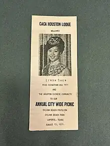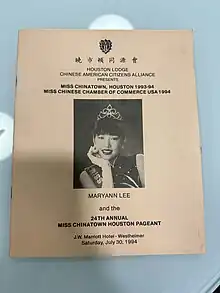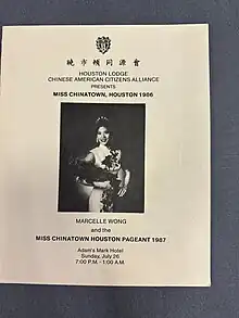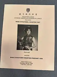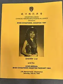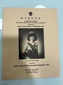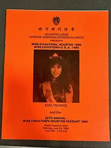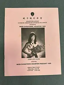 - ↑ "Houston Lodge Chinese American Citizens Alliance Miss Chiantown Houston Pageant 1984".
