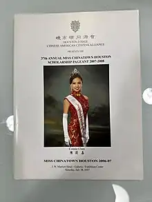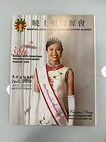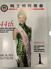 - ↑ ""Houston Lodge CHinese American Citizens Alliance 46th Annual Miss Chinatown Houston Scholarship Pageant 2016"".