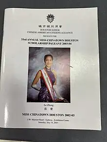- ↑ "Houston Lodge Chinese American Citizens Alliance 30th Annual Miss Chinatown Houston Pageant Program". 2000.