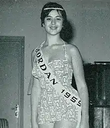 Miss Jordan was founded in 1959 and organized by Jihad Magazine under the directorship of John Halabi. It was an annual event held with the patronage of the Ministry of Tourism and Antiquities under Minister Ghaleb Barakat. Miss Jordan featured contestants from both Transjordan and West Bank which was at that time under Jordanian administration. Usually, two titles were awarded at the pageant - "Miss Jordan" and the runner-up "Queen of Elegance". From 1959 to 1964, the pageant took place at the Hotel Philadelphia in Amman and was later moved in 1965 to Hotel Panorama in the city of Beit Jala in West Bank.[2] Ufemia Rizk née Jabaji became the first Miss Jordan 1959. The pageant became the national franchisee of Miss World in 1959 and sent the first ever international representative from Jordan to Miss World the same year.[3]
