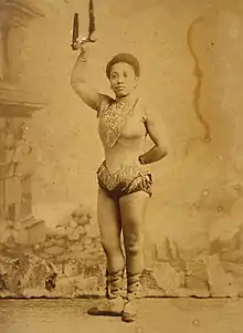 La La began touring as a child, approximately around age nine, when her mother placed her in the circus.[6] She used multiple stage names throughout her career including Olga the Negress, Venus of the Tropics, African Princess, and Olga the Mulatto. She was also billed as La Femme Canon, La Mulatresse-Canon, and Black Venus.[1][7] She played venues such as the Folies Bergère[8][9] in Paris, the Royal Aquarium in London, and the Gaiety Theatre in Manchester.[5] With Troupe Kaira, La La performed a flying trapeze and human cannon ball act.[5] One of her signature acts involved being "pulled up to the height of the circus tent by biting down on a rope." The feat was performed at the height of 200 feet.[10] Another signature stunt involved hoisting other people or a 200-pound cannon with her teeth. She was also known for her stunt of being hoisted up to her trapeze by her teeth.[7] At age 21, La La became the subject of Edgar Degas's sketches, leading to his 1879 painting Miss La La at the Cirque Fernando.[1] La La performed up until the late 1880s.