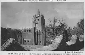 The construction started in 1928. Completed in 1930, it received the name of Missiri, which means "mosque" in the western African language Bambara. Its architecture is inspired by that of the Great Mosque of Djenné in Mali.[12][13][4] A second replica of this mosque existed in France. Built in the Bois de Vincennes, for the Paris Colonial Exposition of 1931, it was demolished shortly after the end of the exhibition.