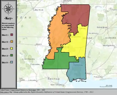 Table of United States congressional district boundary maps in the State of Mississippi, presented chronologically.[3] All redistricting events that took place in Mississippi between 1973 and 2013 are shown.