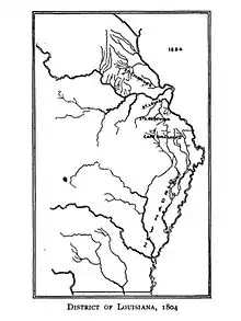 The history of the Arkansas militia begins in 1804, when the United States bought a huge tract of land west of the Mississippi River from France. At the time of the transaction, now known as the "Louisiana Purchase", the area that would eventually enter the Union as the State of Louisiana was referred to as the District of Orleans. The area north of present-day Louisiana was referred to as the District of Louisiana. At first the new "District of Louisiana" was attached to Indiana Territory for administrative purposes. In 1804 the District of Louisiana was designated as the Louisiana Territory and the new territory was subdivided into districts – namely, St. Charles, St. Louis, Ste. Genevieve, Cape Girardeau, and New Madrid – stretching along the Mississippi River with no definite boundaries to the west. The area of the present State of Arkansas lay within the District of New Madrid, which stretched from the present Arkansas-Louisiana state line to the present city of New Madrid, Missouri.[1] The authorities found that there were few people in the new territory, especially the area which was later to become Arkansas, to enroll in the militia. Low and swampy, early Arkansas attracted few settlers, and many of those who did come were itinerant French hunters and trappers who were hardly temperamentally fit for the militia, which required a fairly settled population. The last census conducted under French rule in 1803 "estimated" that the Arkansas Post District had a population of 600 with a militia of 150.[2]