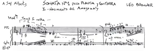 Brouwer defines this work as his first sonata for flute and guitar, and especially dedicated the work to Albertz, who played the world premiere in the German city of Leipzig on September 4 of that year, in the Peterskirche, as part of the closing concert of the International Festival "Con Guitarra" under the cultural patronage of the German Section of UNESCO.[1]