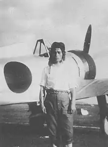 ![]() Mori poses in front of a Mitsubishi A5M fighter while serving with the 12th Air Group in China in 1938 or 1939 | |