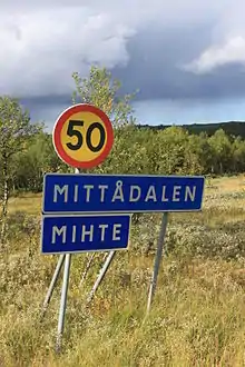 Roadsign at Mittådalen. Both in Swedish and Sami (2013)