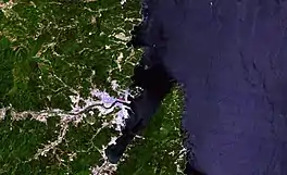 Miyako Bay (宮古湾, Miyako-wan) is a bay in Iwate Prefecture, in the northern Tōhoku region of northern Japan. It is a long and narrow, roughly triangular body of water extending southwest to northeast where it opens to the Pacific Ocean. The Omoe Peninsula (重茂半島, Omoe-hantō) forms its southern border and Cape Anegasaki (姉ヶ崎, Anegasaki) forms its southern border. This gives it an area of approximately 24 km2 (9.3 sq mi). [1]