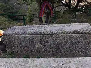 After the Ottomans captured and destroyed Halidzor fortress, Mkhitar managed to escape towards Kapan and continue a guerrilla campaign against the Ottoman invaders. However, the Armenian forces faced replenished Ottoman forces, lacked a single headquarters and were plagued by internal disagreements.[1] In 1730, Mkhitar was murdered by Armenian villagers of Khndzoresk, who had implored him to have his own fortifications destroyed during his conflicts rather than their village. His head was presented to the Ottoman Pasha at Tabriz, who found this act of treachery detestable and had the murderers decapitated.[2] The tomb of Mkhitar Sparapet is located in a gorge not far from Nerkin Khndzoresk and Old Khndzoresk. The inscription on the tomb, which incorrectly dates Mkhitar's death to 1726, writes that he was "from the land of Ganja" and "died young without having reached his goal."[3]
