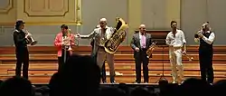 Mnozil Brass is an Austrian brass septet. They play classical, jazz and other styles of music using traditional brass instruments and more unusual instruments such as the customized rotary valved trumpet and bass trumpet. Music is presented with a typical Austrian style of humour, which can be approximately characterized as "jet black" and "here and there" absurd.[1] Elements of slapstick exist next to virtuosic brass playing. They are often popularly referred to as "The Monty Python of the musical world".[2] Austrian and German schlager songs of the 20th century are often caricatured.