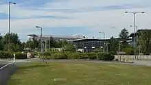 A total of 69 sites were originally considered for the headquarters of the MOD's procurement organisation, with Solihull, Sunderland, Keynsham and South Wales being amongst the other options. Work commenced in September 1993 to build MOD Abbey Wood's offices, restaurants, library, sports facilities, training rooms, auditoria and conference rooms, support facilities and nursery.[3] The site was designed with a feel of connecting "neighbourhoods" and is surrounded by an artificial lake for security.[4][5]