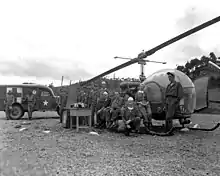The Korean War played a great role in defining MASH units. High casualties in the front line called for onsite paramedic care, such as ambulances and medical tents. Having learned from World War II that transporting wounded soldiers to rear hospitals was highly inefficient in reducing mortality rate, MASH units were established near front lines to supply mobile and flexible military medical care. They contributed to making improvements in resuscitation and trauma care, patient transport, blood storage and distribution, patient triage, and evacuation.[14] The aeromedical evacuation system was developed to transport soldiers by aircraft at a quicker pace. Helicopters were frequently used as "air ambulances" during the Korean War, with the Bell H-13 serving as a predominant medical evacuation aircraft during the war. Military doctors stabilized wounded soldiers midair before getting them to a field hospital. MASH onsite paramedic care and air ambulance system decreased post evacuation mortality from 4% in World War II to 2.5% in the Korean War.[15][16]