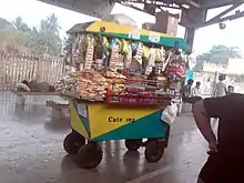 A food cart is a motorless trailer that can be hauled by automobile, bicycle, or hand to the point of sale, often a public sidewalk or park. Carts typically have an onboard heating and/or refrigeration system to keep the food ready for consumption. Foods and beverages often served from carts include