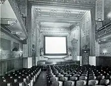 Boston businessman George White hired Clarence H. Blackall in 1913 to convert the basement and first two floors into a theater for the newly popular photo-plays. The architect's plan for the first floor shows a vestibule with a circular ticket office and a small lobby opening onto a long, narrow auditorium with a balcony, seating about 800 in total.[4] There was a small stage, with an adjoining dressing room, and an orchestra pit, which contained an Estey organ with three manuals and thirty-three ranks of pipes.[5] Acoustic design for the auditorium was done in consultation with Wallace C. Sabine, a professor of physics at Harvard University and a pioneer in architectural acoustics. The interior decoration, described as Florentine Renaissance, used Italian marble, dark mahogany and ersatz tapestry. Blackall also added a neoclassical facade carved from white Vermont marble.[6]