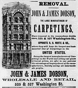 - ↑ "Carpets. Some of the Attractions Shown by Messrs John and James Dobson & Co., 585 Washington Street". Boston Post. March 29, 1878. p. 3. Retrieved December 5, 2022.