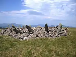 To the north-west of the summit, on an area of moorland and rocky outcrops, lies Bryn Cader Faner, an ancient stone circle. It is one of the finest examples of a Bronze Age cairn in Britain, and has rocky standing stones along its circumference.[2]