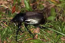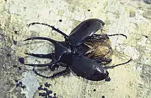 The Moellenkampi beetle (Chalcosoma moellenkampi), is one of four large species of rhinoceros beetles from Southeast Asia belonging to the genus Chalcosoma.[1] The Moellenkampi beetles belong to the beetle family Scarabaeidae along with other rhinoceros beetles. They are characterized by having two large, forward-projecting horns on the pronotum or thorax, and another large, forward and upward-projecting horn on the head. They also have a distinct metallic lustre, which is the reason behind their genus name, which derives from Greek, chalko-, and is the combining form of chalkós, meaning copper.[2]