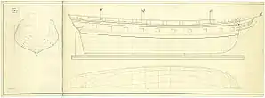 The Royal Navy purchased Mohawk immediately after her capture, and in November had her hull coppered at Antigua. A draught of Mohawk's lines shows her as having ten gun ports on each side of her gun-deck, and nine ports on each side in the bulwarks of what is apparently a continuous upper deck.[2]